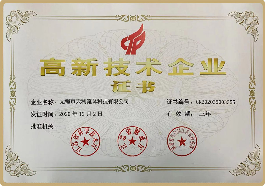 根据《高新技术企业认定管理办法》和《高新技术企业认定管理工作指引》的相关规定,无锡市天利流体科技有限公司被认定为高新技术企业。近日,我司已收到了由江苏省科学技术厅、江苏省财政厅、国家税务总局江苏省税务局联合颁发的“高新技术企业证书”,正式迈入高新技术企业行列。